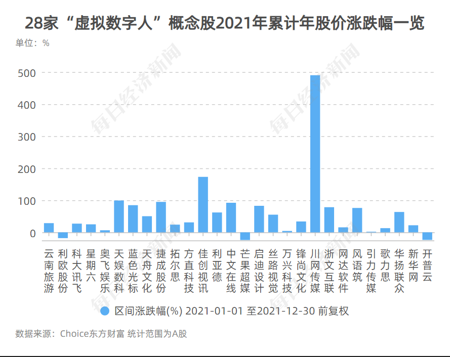 具体到“虚拟数字人”板块,2021年在28家概念股中,仅有3家公司的年股价累计涨幅为下跌,其余25家公司的年股价在2021年一整年的累计涨幅均为上涨,其中,川网传媒、佳创视讯在2021年年股价累计涨幅最高,涨幅分别高达490.28%、172.98%。