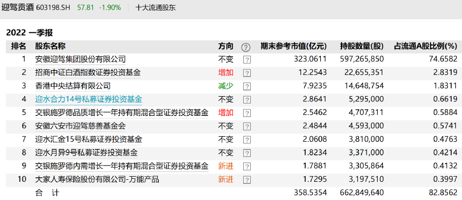 另外,迎水投资旗下的迎水合力14号私募基金、迎水汇金15号私募基金、迎水月异9号私募基金三只产品合计持有迎驾贡酒1247.6万股,期末持股市值为6.74亿元,保持持股不变。