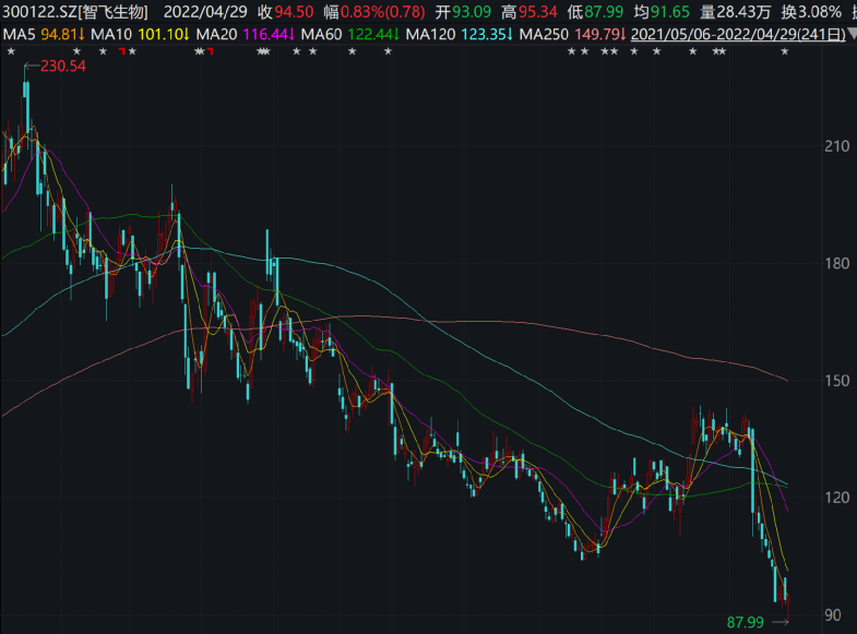 但是,智飞生物在过去一年左右的时间里,股价却跌跌不休。截至4月29日收盘,智飞生物报收94.50元/股,较去年5月的高位230元已附近经跌去一半多,最新总市值为1512亿元。而迎水投资在今年一季度就出手逆市加仓、“抄底”了。
