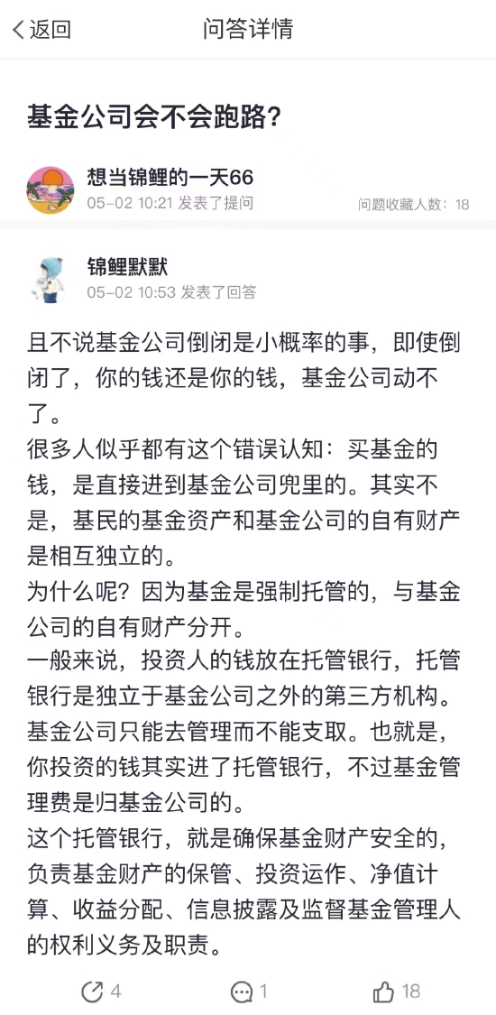 为什么呢?因为基金是强制托管的,与基金公司的自有财产分开。一般来说,投资人的钱放在托管银行,托管银行是独立于基金公司之外的第三方机构。基金公司只能去管理而不能支取。也就是,你投资的钱其实进了托管银行,不过基金管理费是归基金公司的。