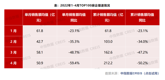 1-4月累计来看,据中指研究院统计,TOP 100企业拿地总额3626亿元,拿地规模同比下降55.9%。