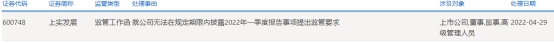 中国经济网北京5月5日讯上交所于4月29日向上实发展(600748.SH)下发监管工作函,处理事由为就公司无法在规定期限内披露2022年一季度报告事项提出监管要求,涉及对象为上市公司,董事,监事,高级管理人员。