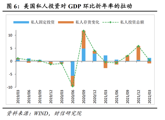 具体从数据看,美国经济短期陷入衰退的风险确实亦不大。如2022年一季度美国GDP环比折年率-1.4%,较去年四季度大幅回落8.3%。但从各分项看(见图5-6),GDP增速下降由私人库存和净出口的波动所拖累,而这两个波动性较大的类别在上个季度的变动可能对未来的增长没有过强信号意义;相比之下,主导美国经济增长的私人消费支出和企业固定资产投资持续保持较快增长,且预计在美国居民部门资产负债表较为健康、劳动者报酬持续上涨、服务消费继续恢复和新一轮朱格拉周期仍处于上升阶段的共同支撑下,未来美国私人消费支出和固定资产投资仍有一定韧性。