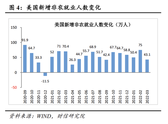 二是美国劳动力市场持续强劲,也对美联储货币收紧形成支撑。本次议息会议依旧认为美国“就业增长强劲”,同时鲍威尔在会议后的发言中也持续强调劳动力市场极其紧张,表明就业数据也对货币收紧形成支撑。具体看,今年前三个月美国新增非农就业人数增加近170万人(见图4),远高于疫情前月均增加20万人的水平,若按照这一速度继续恢复,美国非农就业人数将在一个季度左右完全恢复至疫情前水平。此外,美国失业率继续下降,3月份该比率达到3.6%,较疫情前最低点仅高0.1个百分点;美国劳动参与率也在稳步回升,3月份较2月份提高0.1个百分点至62.4%。