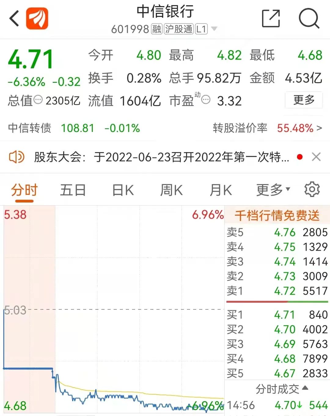 从市场表现来看,配股预案发布后的首个港股交易日(5月3日),中信银行H股跳空低开,截至收盘报3.73港元/股,跌幅近7%;节后首个A股交易日(5月5日),中信银行A股重演相同一幕,当日报收4.71元/股,跌6.36%。