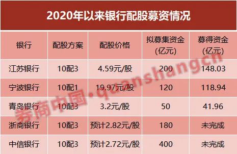 在中信银行之前,已有江苏银行、宁波银行、青岛银行、浙商银行4家银行先后完成或披露配股募资方案。其中,率先“重启”配股募资工具的江苏银行成为了银行首例配售价格低于每股净资产价格的配股,被业内视为“标志性事件”。
