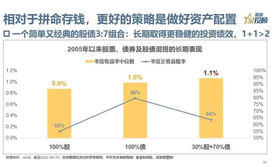 10、相对于拼命存钱,其实更科学的策略是通过资产配置,拓展资产收益的边界,并分散风险。在资本市场,投资收益和资产安全性往往是鱼和熊掌的关系;但根据股债周期的不同和资产属性的差异,合理的组合还是能既得熊掌又取鱼。