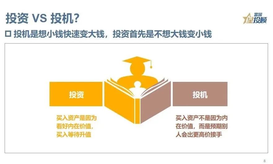 8、投资还是投机?要正确看待。对于投资,买入资产是因为看好内在价值,所以长期持有,等待价值实现。对于投机,买入资产并不是因为内在价值,而是预期别人会更高价接手,快速小钱变大钱。