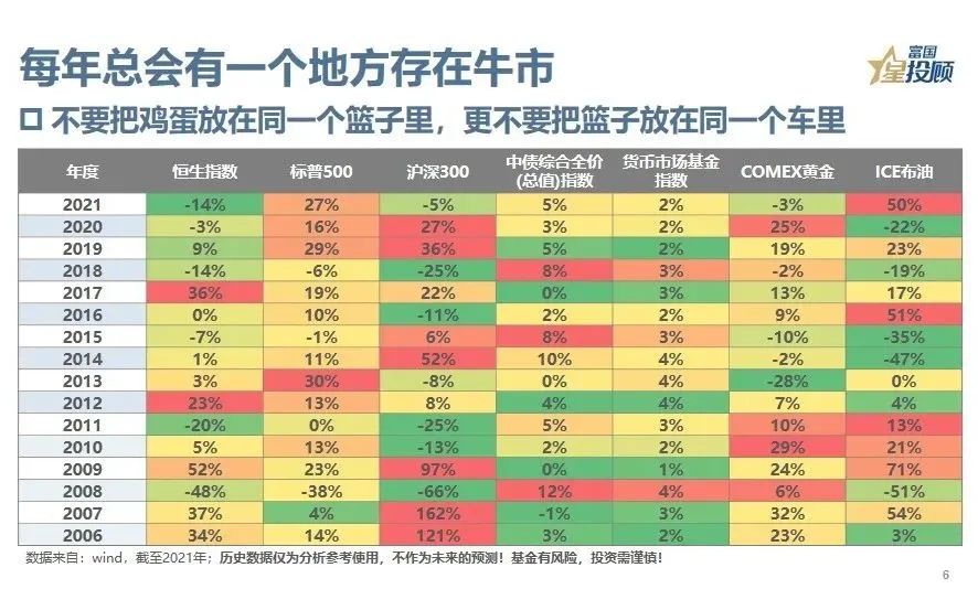 11、不要把鸡蛋放在同一个篮子里(资产选择),更不要把篮子放在同一个车里(资产配置)。虽然每年总有一个地方会存在牛市,但孤注一掷,可能只有痛苦、煎熬和等待。就像西西弗斯一样,不断推着滚石上山,又经历着滚石一次次从顶峰回落的焦虑…...