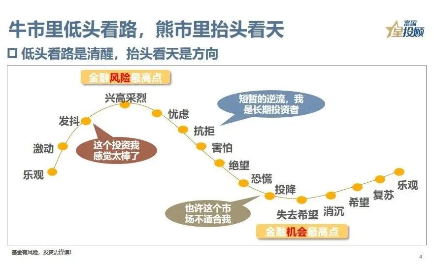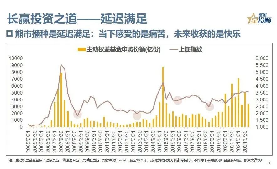 3、人生如戏,投资如人生。“即时满足”是人性使然,但“延迟满足”才是长赢之道。一是立足长期的眼界,二是抵制诱惑的自律,三是逆流而上的勇气。就投资而言,熊市播种就是一种“延迟满足”,当下感受的是痛苦,未来收获的是快乐。
