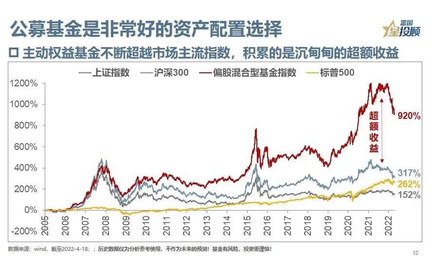 12、A股市场对投资者不一定友好,但国内基金市场一定要被温柔以待,因为公募基金是非常好的资产配置选项。自2005年以来,主动权益基金不断超越市场主流指数,甚至是“股神巴菲特”推荐的标普500,其积累的超额收益就是“创造价值”的最好证明。