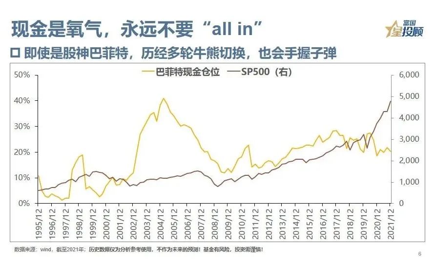 6、现金是氧气,永远不要“all in”。因为无法预测,所以唯有应对,只有手握子弹,才有回旋余地。即使是股神巴菲特,历经多轮牛熊,也一直手握现金,对市场保持敬畏。