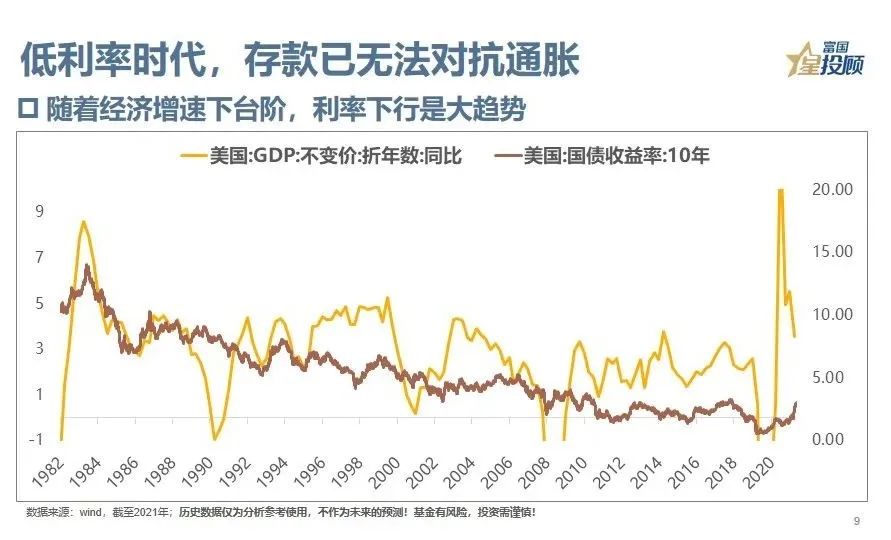 9、低利率时代,存款已无法对抗通胀。从海外经验看,利率水平和经济增速是相伴相生的,随着经济增速的下台阶,利率也会跟随下台阶。然而,极低的利率水平,已经无法让大家通过储蓄,来实现财富不缩水。