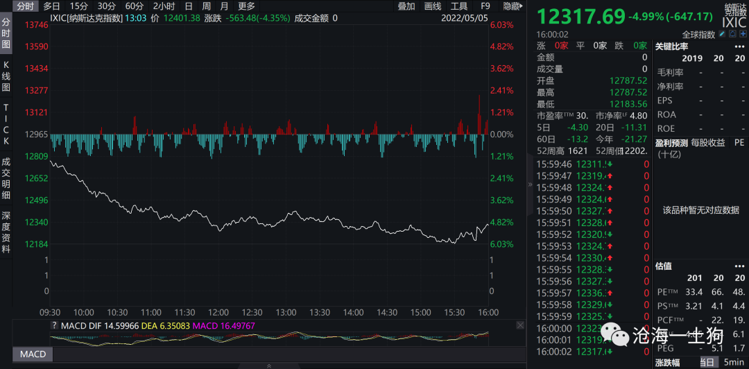 股市方面,纳斯达克指数一度跌6%,收盘跌4.99%。