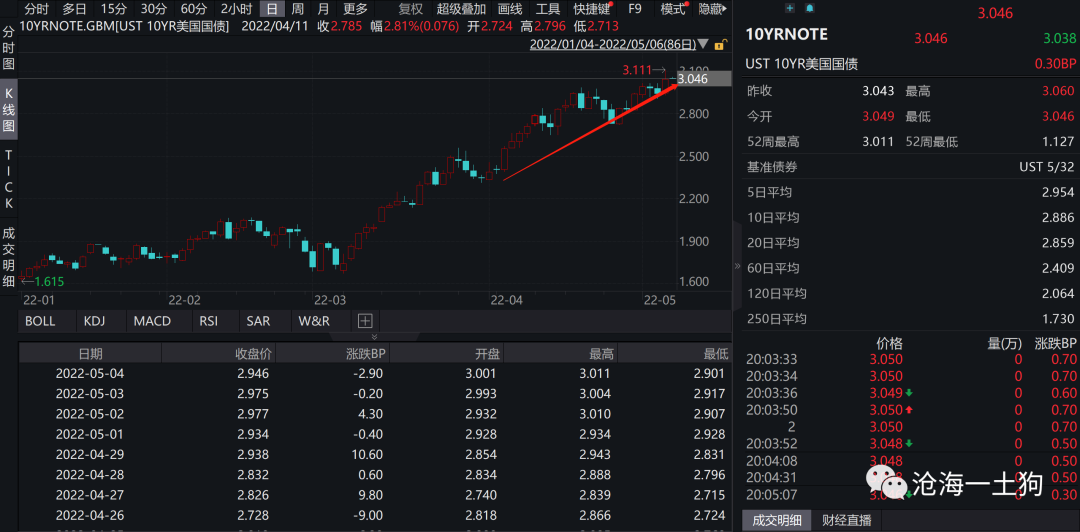 债市方面,十年美债一度上到了3.11%,收盘在3.05%。
