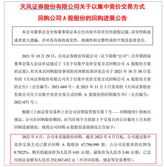 具体来看,截至今年4月底,天风证券已通过集中竞价交易方式累计回购A股股份6778.70万股,占公司总股本的比例为0.78%,购买的最高价为4.01元/股、最低价为3.48元/股,已支付金额2.53亿元(不含印花税、佣金等交易费用)。