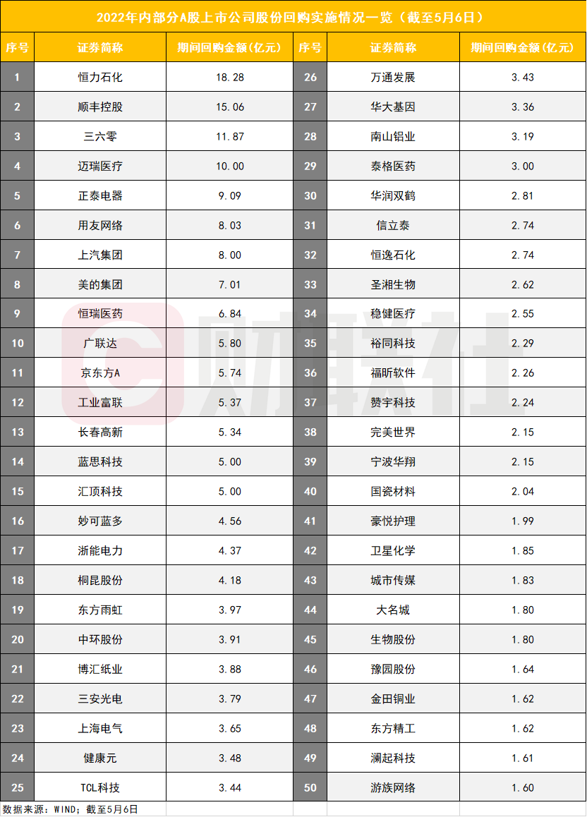 有多达78家上市公司累计回购规模过亿。其中,恒力石化、顺丰控股、三六零、迈瑞医疗等今年来均已斥资10亿元以上进行股份回购;另有正泰电器、用友网络上汽集团、美的集团等4家公司已斥资7亿元以上回购。