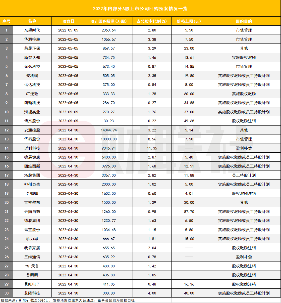 不过相较于此前近九成公司是为实施股权激励或员工持股计划的目的不同,5月以来公布预案的11家公司中,有3家是出于市值管理的目的。