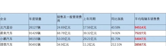 公开数据:2021年蔚来销售及一般管理费用为68.78亿元,平均单车销售及一般管理费用达到了7.52万元;小鹏汽车去年销售及一般管理费用为53.05 亿元,平均单车此类费用为5.41万元;理想汽车去年销售及一般管理费用为34.92 亿元,平均单车此类费用3.86 万元。