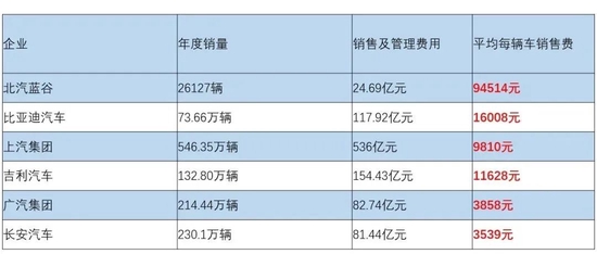 广汽集团的销售费用和管理费用分别是43.40亿元、39.34亿元,当年汽车销量是214.44万辆,平均每台车的销售、管理成本是3858元;