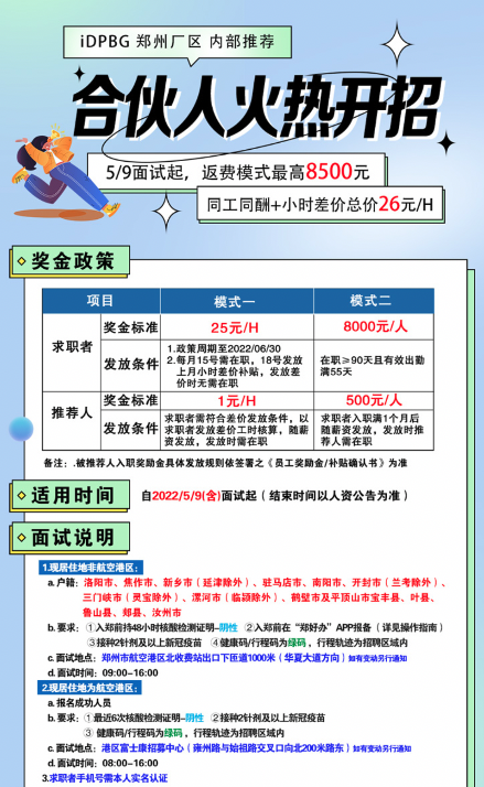 此次郑州富士康5月招聘不仅提供接送福利,同时也加大了招工薪资激励。上述“我要聘”App显示,富士康为内部推荐、离职返聘等新招募的员工开出了大手笔的激励奖金,如在职工人推荐新人入职,且新人在职大于等于90天,双方均可获得现金奖励,最高达每人8000元。