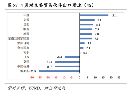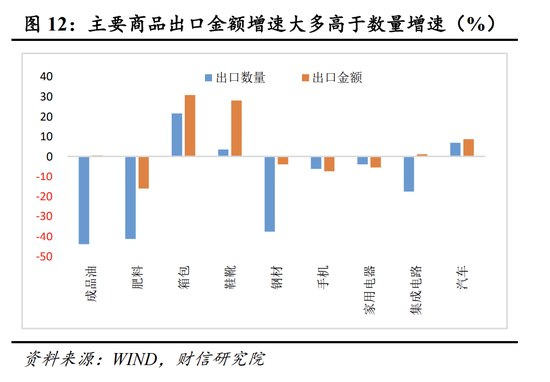三是分数量和价格看,价格因素对出口增速的贡献较大。由于出口价格指数和出口数量指数公布时间滞后,我们通过监测重点商品的出口金额和出口数量的关系,判断数量因素和价格因素对出口的贡献。4月份我国主要商品出口金额增速大多高于数量增速(见图12),表明价格因素对出口增速的贡献较大。