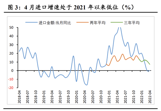 2022年4月份进口金额同比持平,较3月份提高0.1个百分点,增速处于2021年以来低位(见图3)。