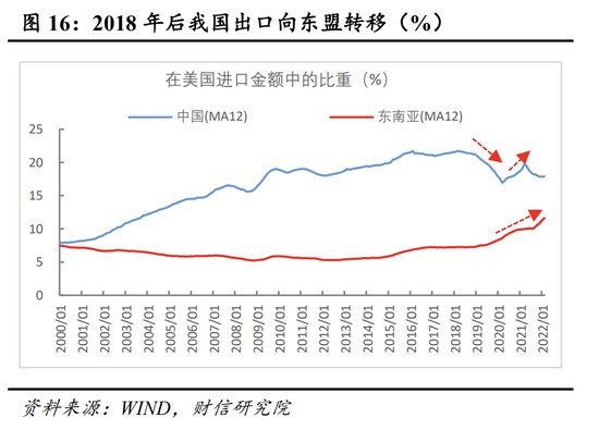 二是东盟等经济体产能修复提速,我国出口替代效应趋于减弱。2018年以来我国就有出口向东盟转移趋势(见图16),疫后由于我国具备产能优势,贸易转移趋势有所放缓。预计在病毒传染性较过去明显加强和国内坚持“动态清零”的背景下,国内产能将持续受到疫情扰动,出口替代效应大概率持续减弱,甚至可能出现东盟等地对我国的“逆替代”。
