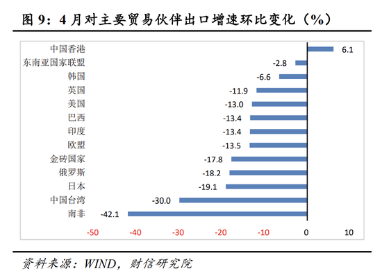 三、高基数、外需放缓和国内产业链供应链受阻,共同致出口增速回落。4月份出口基数较高,是增速下行的原因之一。分国家看,对主要贸易伙伴出口普遍下行,外需全面放缓。分产品看,机电产品出口同比增速转负,是4月份出口的主要拖累项,主要由于国内疫情冲击、产能下降导致,后续机电产品出口有望回升;从价格看,主要出口商品的金额增速均远高于数量增速,表明价格因素对出口支撑仍强。