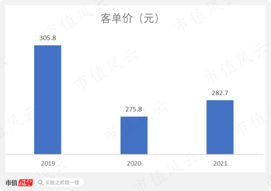 自营上井餐厅的客单价在2019年高达305.8元。2020年由于疫情因素,客单价有所下降,不过也高达275.8元。2021年,疫情有所缓解,客单价小幅提升至282.7元。