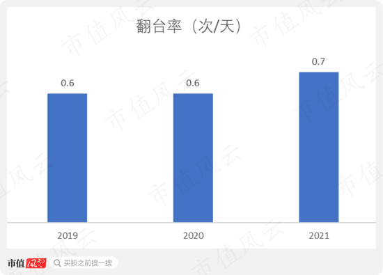 2019-2021年,自营上井餐厅的翻台率一直只有0.6、0.7,还不到1。