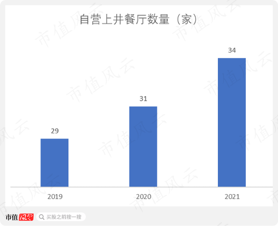 首先是门店数量。自营上井餐厅数量从2019年的29家缓慢增加至2021年的34家,平均一年也就增加2到3家门店。