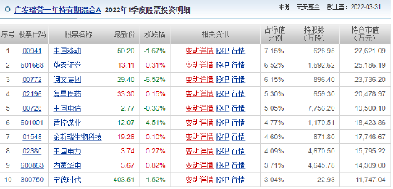 一季报显示该基金重仓了中国移动、华泰证券、阅文集团、复星医药、中国电信、晋控煤业、金斯瑞生物、中国电力、内蒙华电和宁德时代,前十大持仓股合计占比超过50%,分布行业较为分散。
