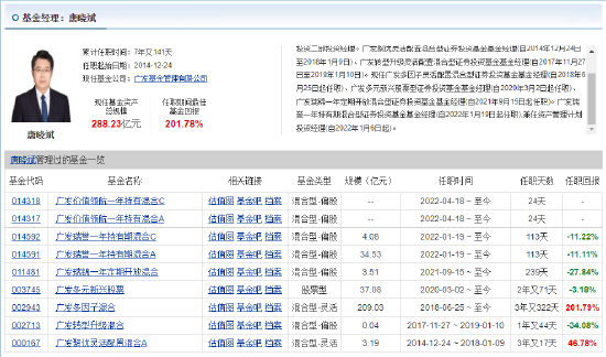 而唐晓斌管理时长超过半年的三只基金,今年以来都下跌超过20%,广发瑞锦一年定期更是跌了27%,都在同类中排名靠后。