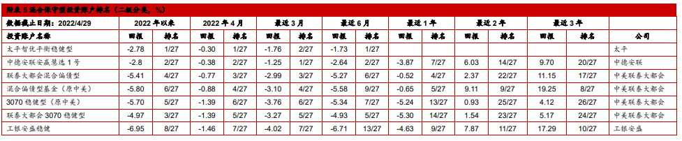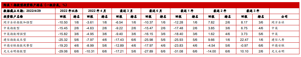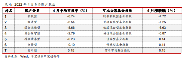4月各类账户回报率排名见下表。