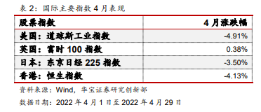 2022年4月国际主要指数表现如下所示: