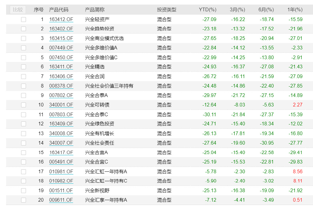 即便时间拉长到一年,也仅有“兴全可转债”“兴全汇虹一年持有”和“兴全汇享一年持有”实现了正收益,难怪基民会失去耐心。