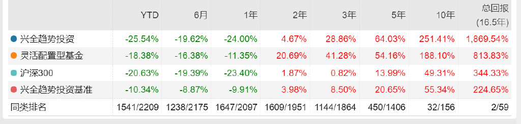 “兴全趋势投资”也是类似的情况,谢治宇于2021年10月20日担任“兴全趋势投资”的基金经理,之前该基金由董承非管理。和前两只基金类似,今年以来,“兴全趋势投资”亏损了25.54%,业绩比较基准为-10.34%,同期的灵活配置型基金平均跌幅为18.38%,同期的沪深300跌幅为20.63%,在同类排名为1541/2209。
