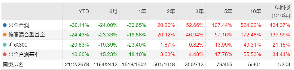 规模最大的“兴全合润”虽然12年的总回报排名同类第一,但是近一年的业绩惨不忍睹。尤其是今年以来,“兴全合润”亏损了30.11%,“兴全合润”的业绩比较基准为-16.60%,同期的偏股混合型基金平均跌幅为24.43%,同期的沪深300跌幅为20.63%,在同类排名为2112/2678。