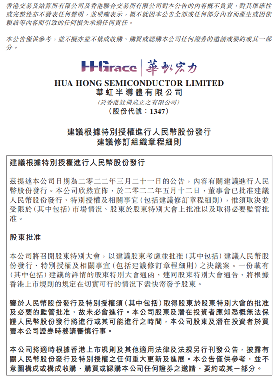 注:华虹半导体走势根据华虹半导体的公告,2022年5月12日董事会已批准建议人民币股份发行、特别授权及相关事宜(包括建议修订章程细则),但仍需等待股东特别大会上批准以及取得必要监管批准。