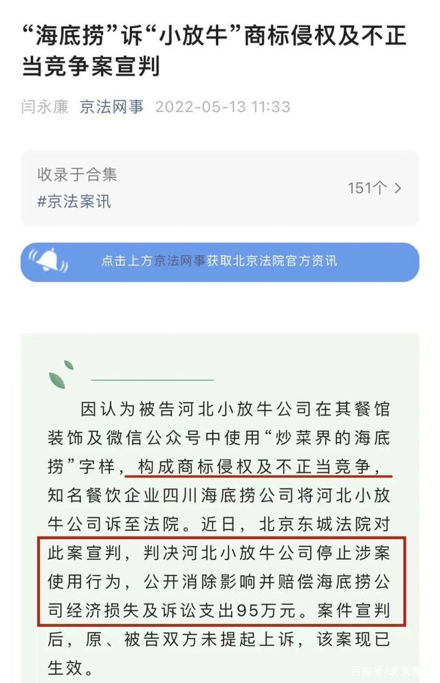 5月13日,北京市高级人民法院官方微信“京法网事”发文称,“海底捞”诉“小放牛”商标侵权及不正当竞争案宣判,判决“小放牛”停止涉案使用行为,公开消除影响并赔偿“海底捞”共计95万元。