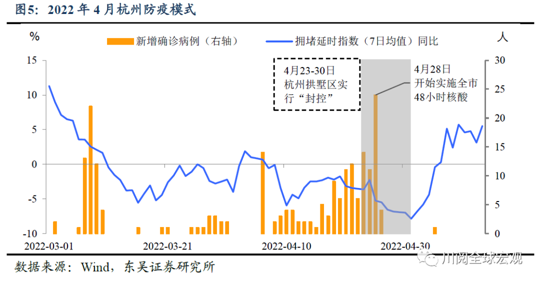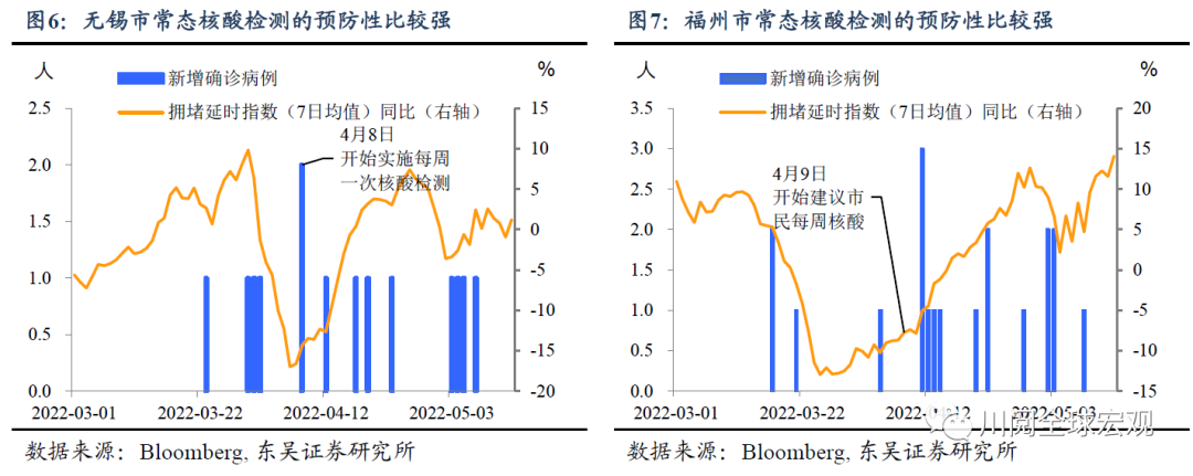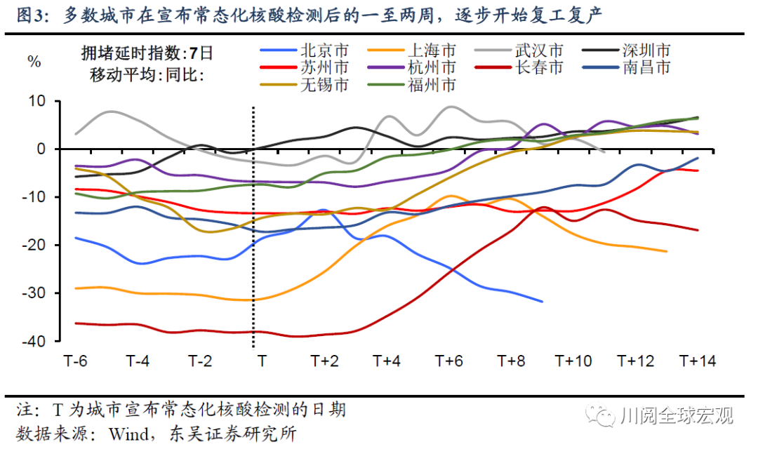 从一些高频数据看,常态化核酸检测的积极作用已经开始显现。4月末以来,在各地因城施策下,常态化核酸检测的实施被不断优化,助力复工复产。多数城市进入常态化核酸检测后的一至两周,新冠感染者数量呈下降态势,拥堵延时指数回升(图2至3)。这也验证了我们此前报告的观点:常态化核酸通过预防式的大范围筛选,在疫情爆发的早期阶段抑制扩散。