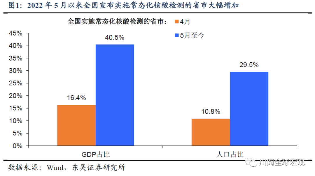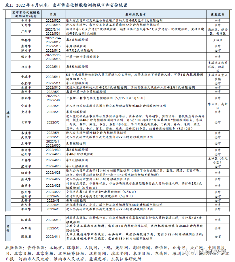 根据我们的统计,截至2022年5月14日,全国已经有28市+3省宣布实施常态化核酸检测,经济总量占2021年中国GDP的41%;涉及人口4.2亿,占2021年全国人口的29%。