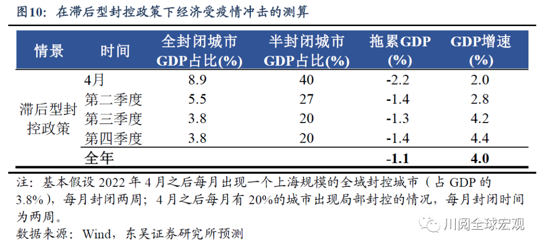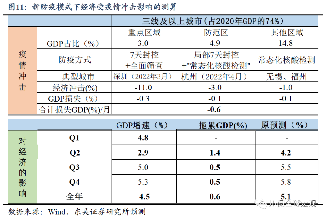 我们预计在不断优化的防疫策略下,疫情对于经济的冲击能够缩小约一半。传统的防疫模式以滞后型封控模式为主,如图10所示,在高传染性奥密克戎病毒的影响下,局部甚至全域封控的城市可能反复出现,对2022年全年GDP的冲击可能达1.1%。