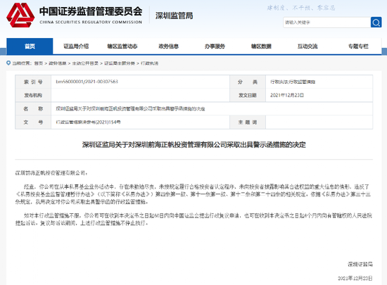2021年12月,深圳证监局对正帆投资采取出具警示函措施的决定。深圳证监局指出,正帆投资在从事私募基金业务活动中,存在未勤勉尽责、未按规定履行合格投资者认定程序、未向投资者披露影响其合法权益的重大信息的情形。