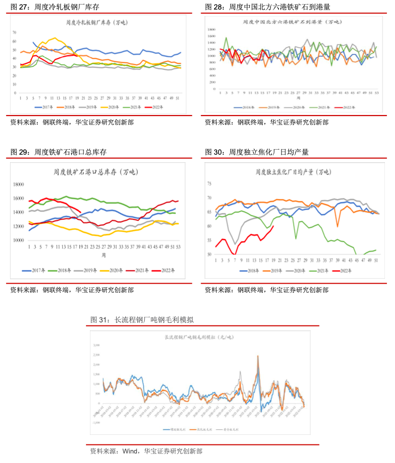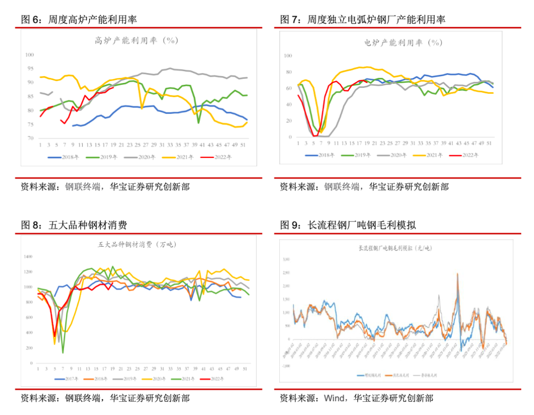 截止5月13日,5月长流程钢厂,螺纹钢吨钢毛利17.22元/吨;热轧板吨钢毛利-83.57元/吨;冷轧板吨钢毛利125.3元/吨。