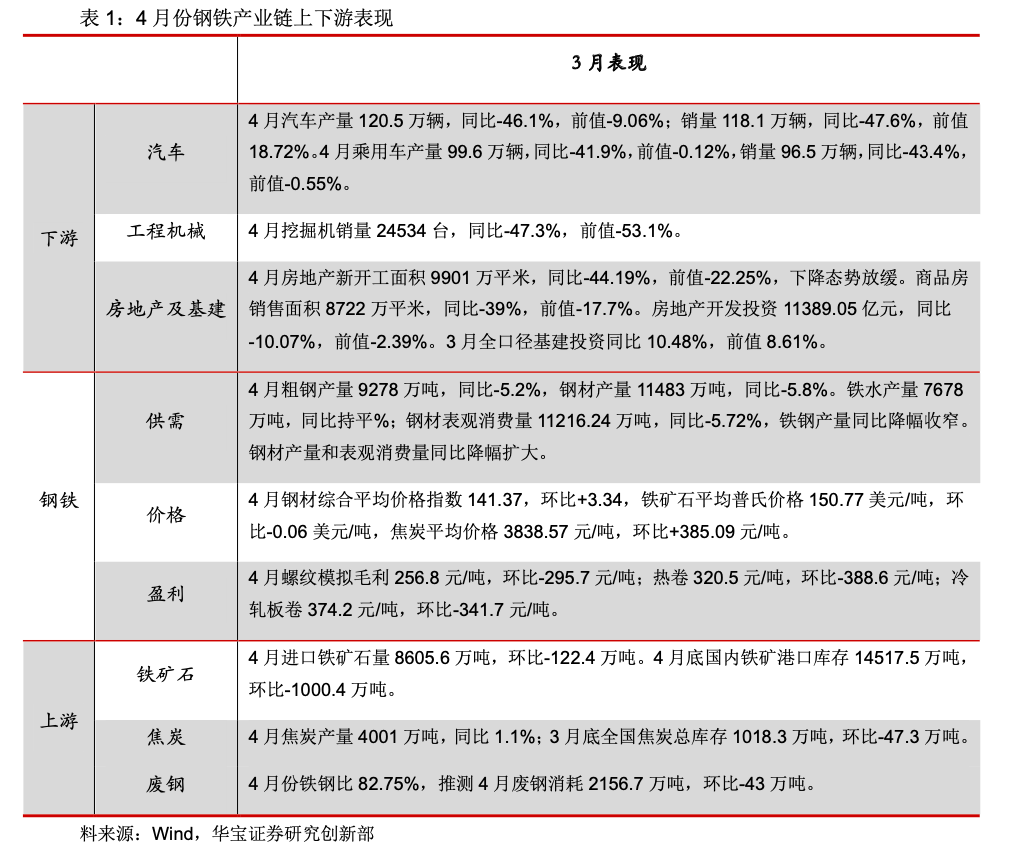 4月受疫情影响,国内部分地区消费场景缺失,钢铁产业链下游汽车、房地产均出现大幅下降。疫情导致部分建筑开工受到较大制约,基建增长出现一定回调。