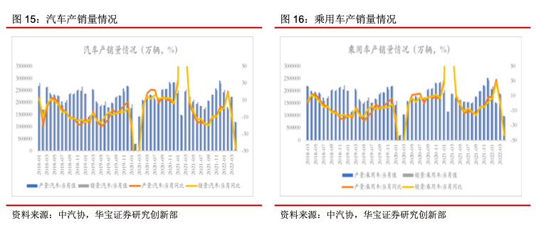 4月汽车产量120.5万辆,同比-46.09%;汽车销量118.1万辆,同比-47.6%。4月乘用车产量99.6万辆,同比-41.91%;乘用车销量96.5万辆,同比-43.4%。整体来看,4月受疫情影响,汽车产业链供需均受到较大冲击,长三角作为国内汽车产业链的主机厂及零部件企业重要集群地区,4月面临停产停工,导致国内汽车产量出现大幅下滑。同时疫情对终端消费的冲击,导致购车需求大幅减少。