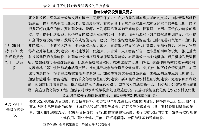 4月下旬以来,国内围绕稳增长涉及投资的相关政策不断加码。从历史数据来看,在经济短期下行压力加大时,投资往往是稳增长的发力点,尤其是基建投资往往起到托底的作用。