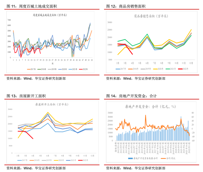 1-4月国内广义基建同比8.26%,不含电力基建同比6.5%;1-4月铁路运输投资同比-7%,前值-2.9%;道路运输投资同比0.4%,前值3.6%;交通运输业投资同比7.4%,前值9.6%;水利、环境和公共设施管理投资同比7.2%,前值8%。整体来看4月也受到疫情影响,部分建筑工地停工,基建投资有一定程度放缓。
